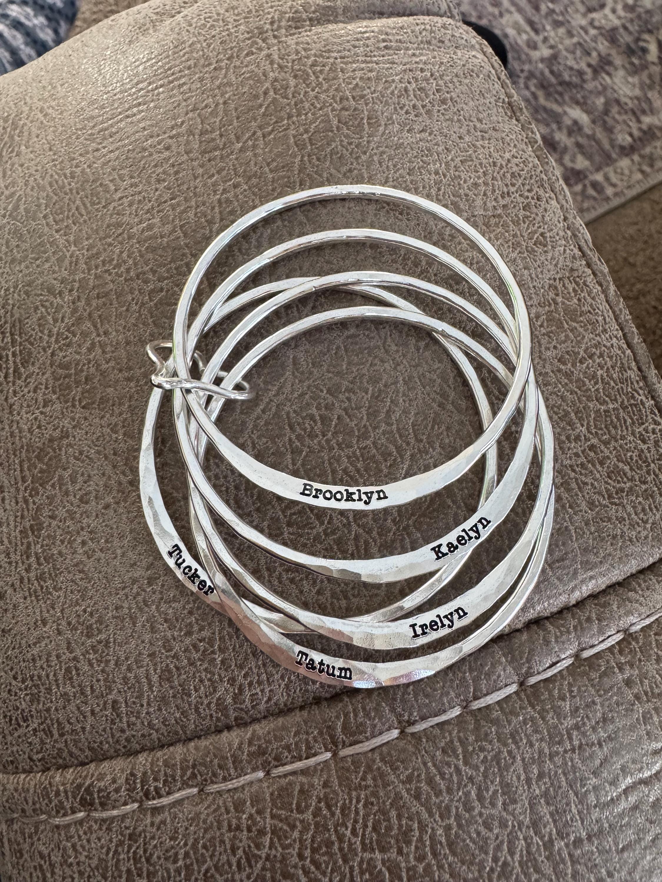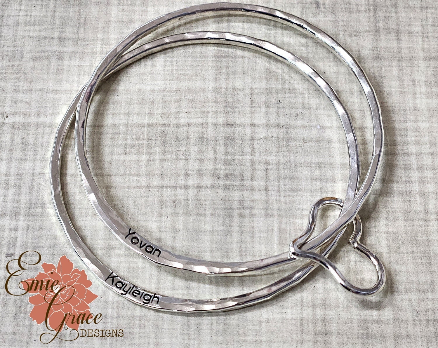 This beautiful mother or grandmother bangle bracelet set is made of sterling silver (92.5%) and is laser engraved with the names of your loved ones. You may select the number of bangles in your set (1-6). Each bangle can have either one flattened area or two flattened areas on opposite sides of the bangle. Each flattened area can be engraved with text (up to 16 characters, counting spaces and punctuation). Text is only engraved on one side of each flattened area. Most people choose to have a name and a date across from each other. The bangles are held together with a hand crafted sterling silver heart. Each bangle has a unique hand-hammered texture that creates facets that catch the light.