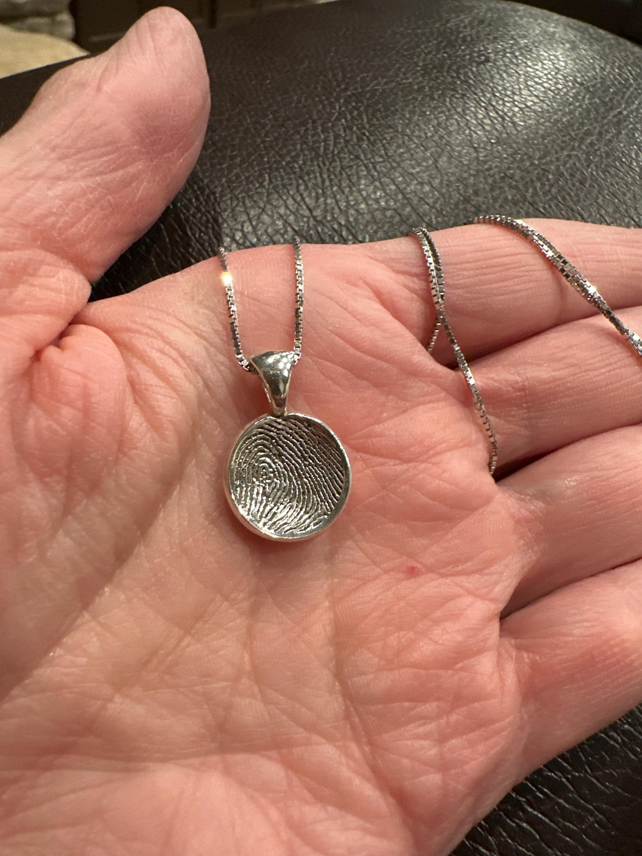 This sterling silver custom fingerprint necklace is the perfect way to carry your loved one close to your heart. The concaved disk and bail are hand forged, it is small to have a delicate look, yet has a sturdy feel with a good weight to it. The fingerprint is deeply engraved so you can feel the ridges and indents of your loved one's unique print. This pendant has space for a short message to be engraved on the back, or a small bit of handwriting. This necklace arrives neatly packaged and ready to wear and enjoy, or give as a gift!