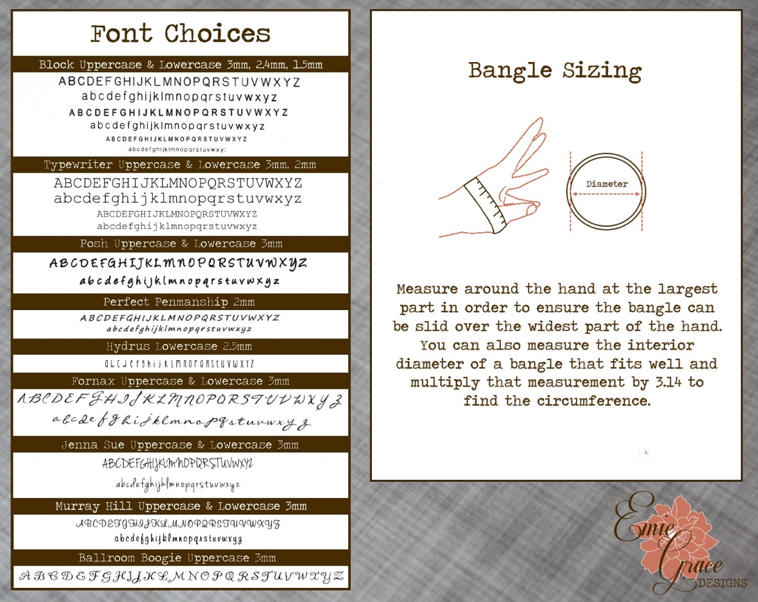 • 1 or 2 flattened text locations on each bangle, (MAX 12 characters of text for each location, counting spaces and punctuation)