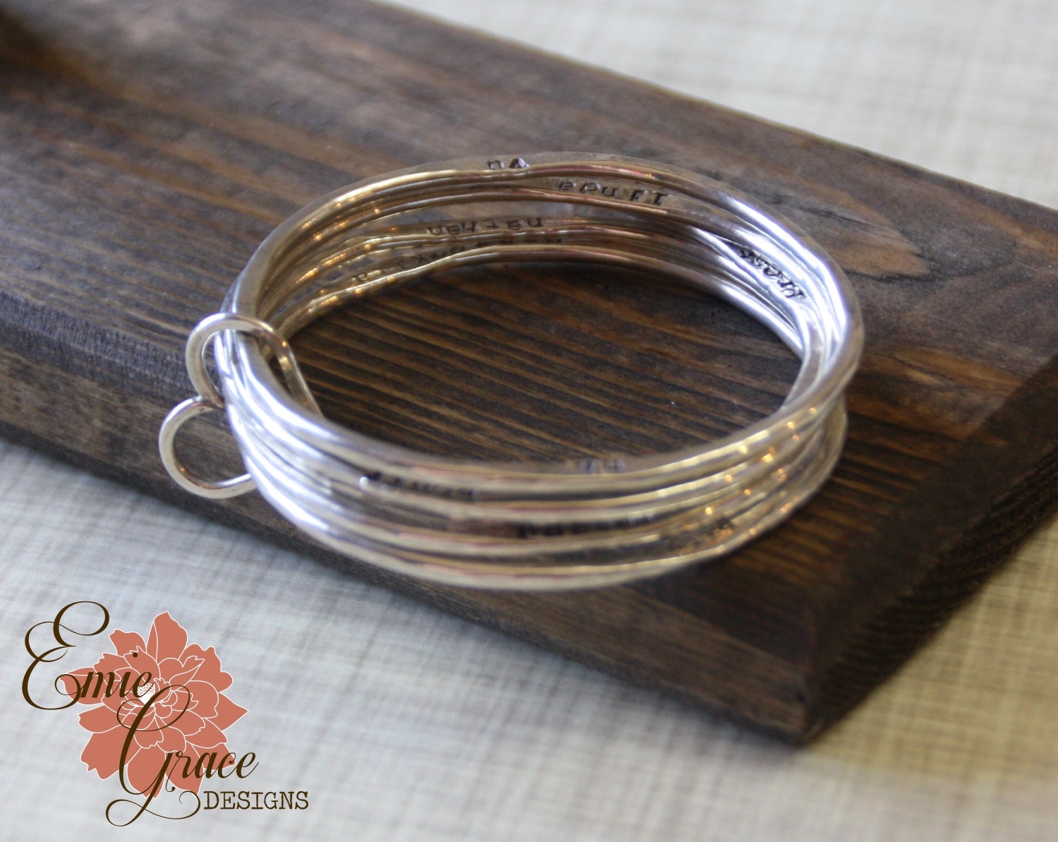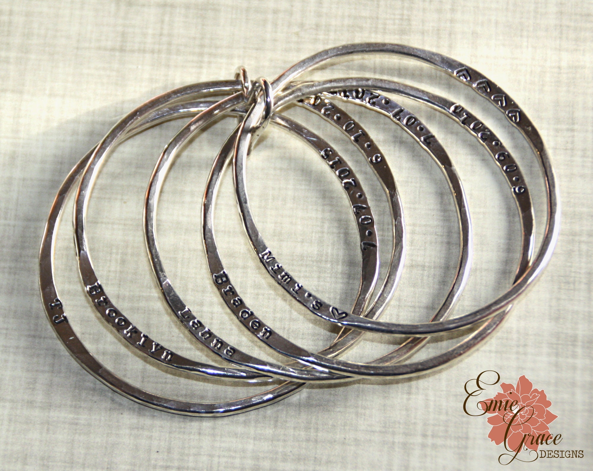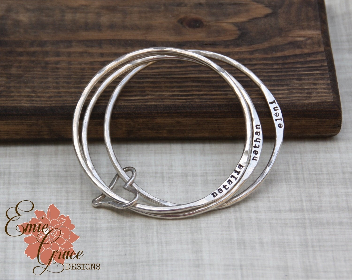 This beautiful mother or grandmother bangle bracelet set is made of sterling silver (92.5%) and is hand stamped with the names and birthdates of your loved ones. You may select the number of bangles in your set (1-6). Each bangle can have either one flattened area or two flattened areas on opposite sides of the bangle. Each flattened area can be stamped with text (up to 12 characters, counting spaces and punctuation). Text is only stamped on one side of each flattened area. The bangles are held together with a hand crafted sterling silver heart. Each bangle has a unique hand-hammered texture that creates facets that catch the light.
