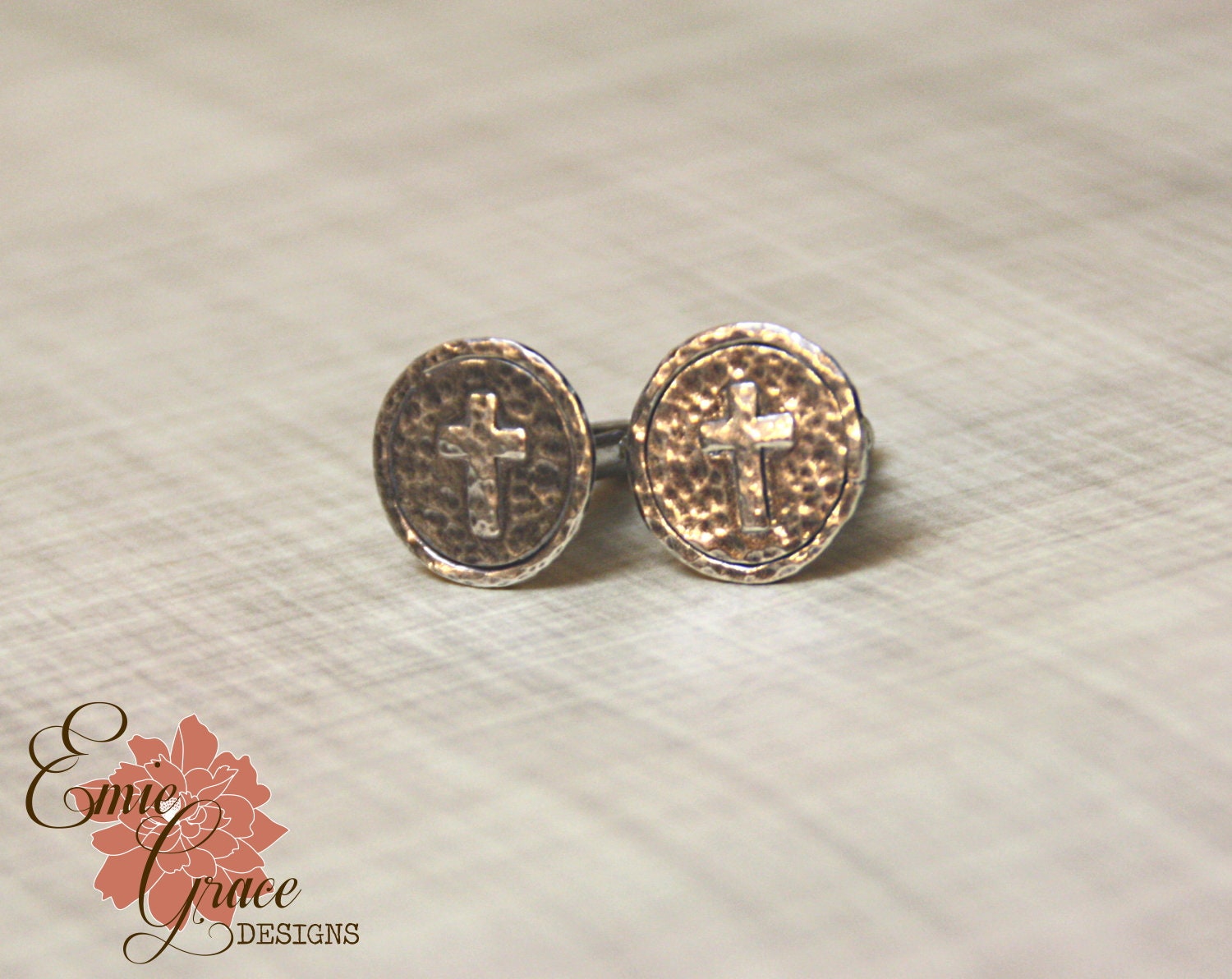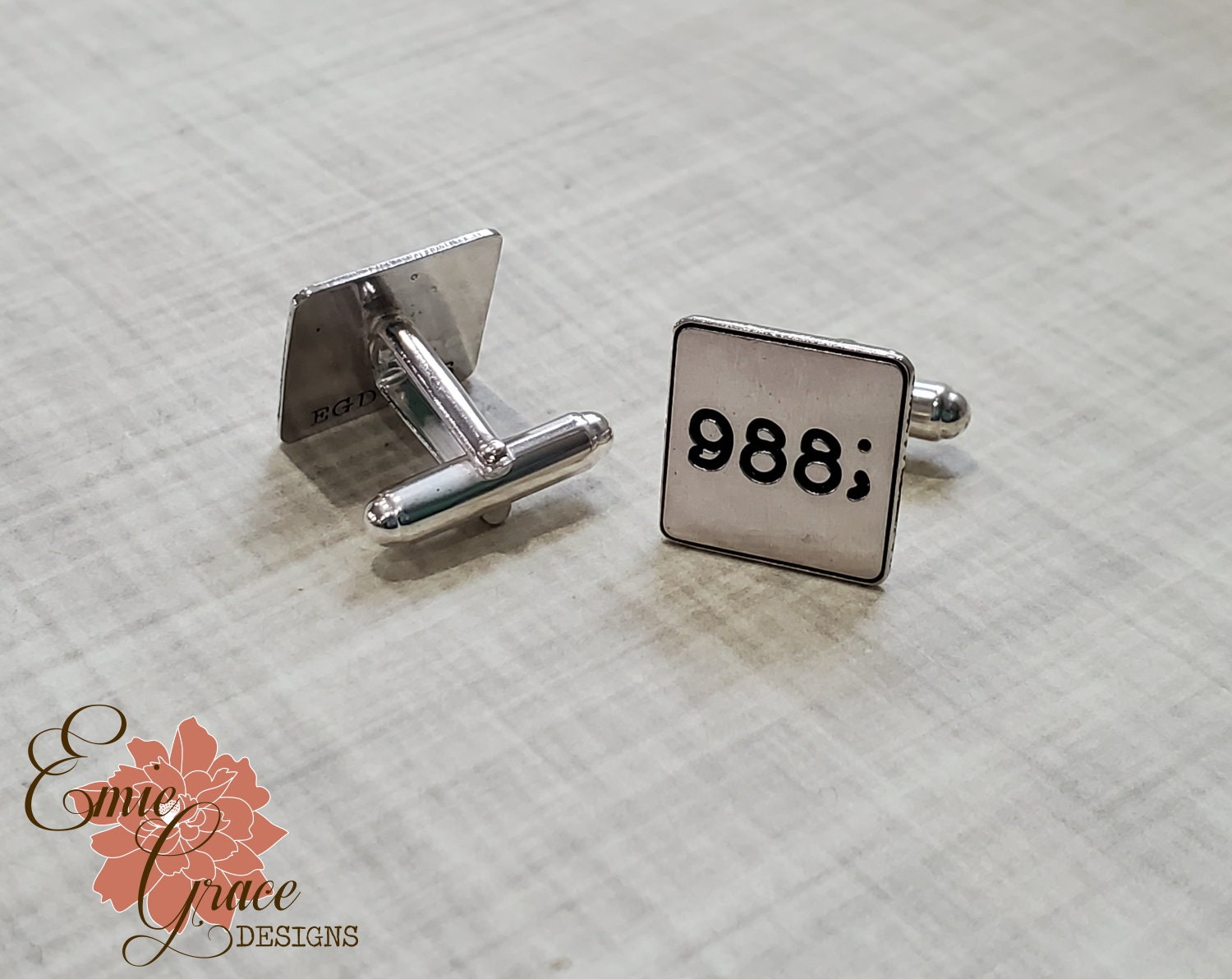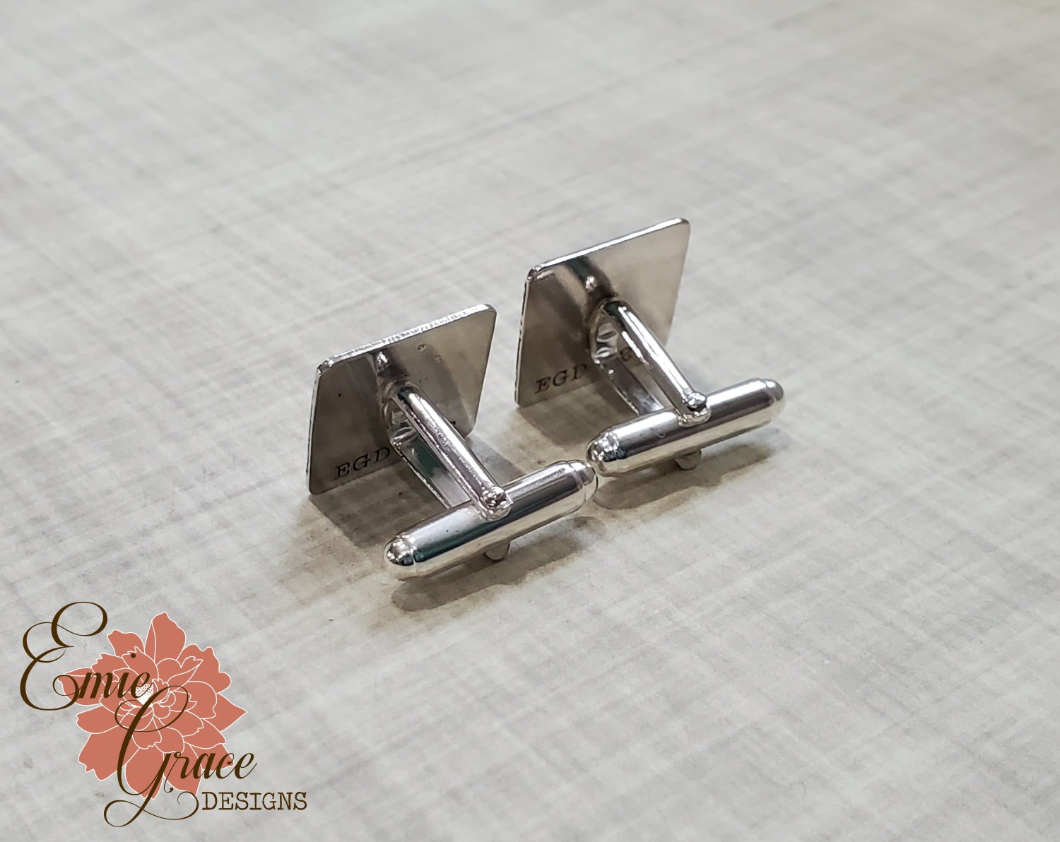 These sterling silver cuff links are hand stamped or laser engraved with the design of your choice. We will work together to create something unique and perfect for you. The photos are of a couple sets I've done recently for customers. They are hand made and finished with a brushed surface or a mirror finish (up to you). The backs are soldered securely in place. This is a perfect gift to for the man in your life who has everything. Cuff links arrive neatly packaged in a gift box and ready to wear and enjoy, or give as a gift!