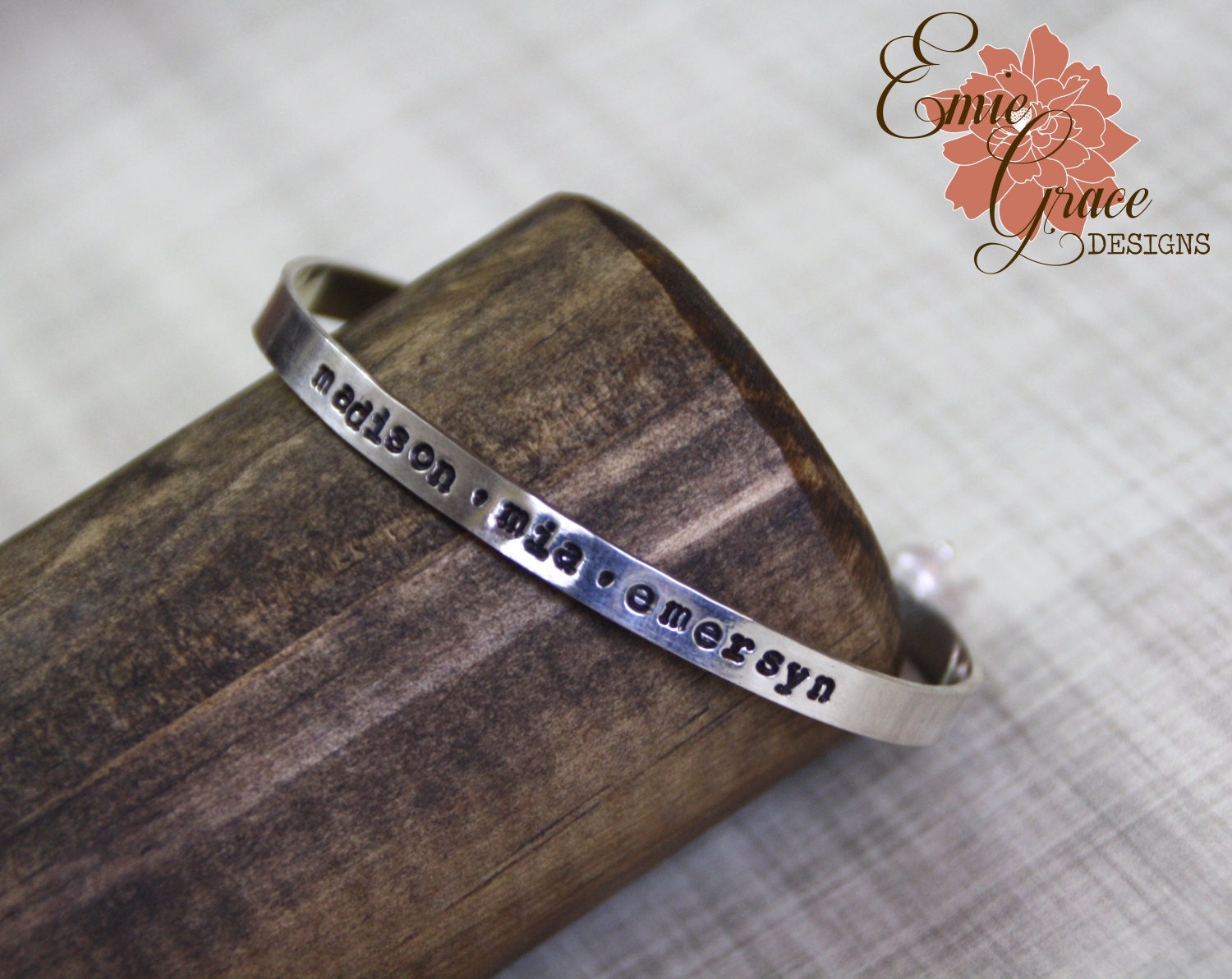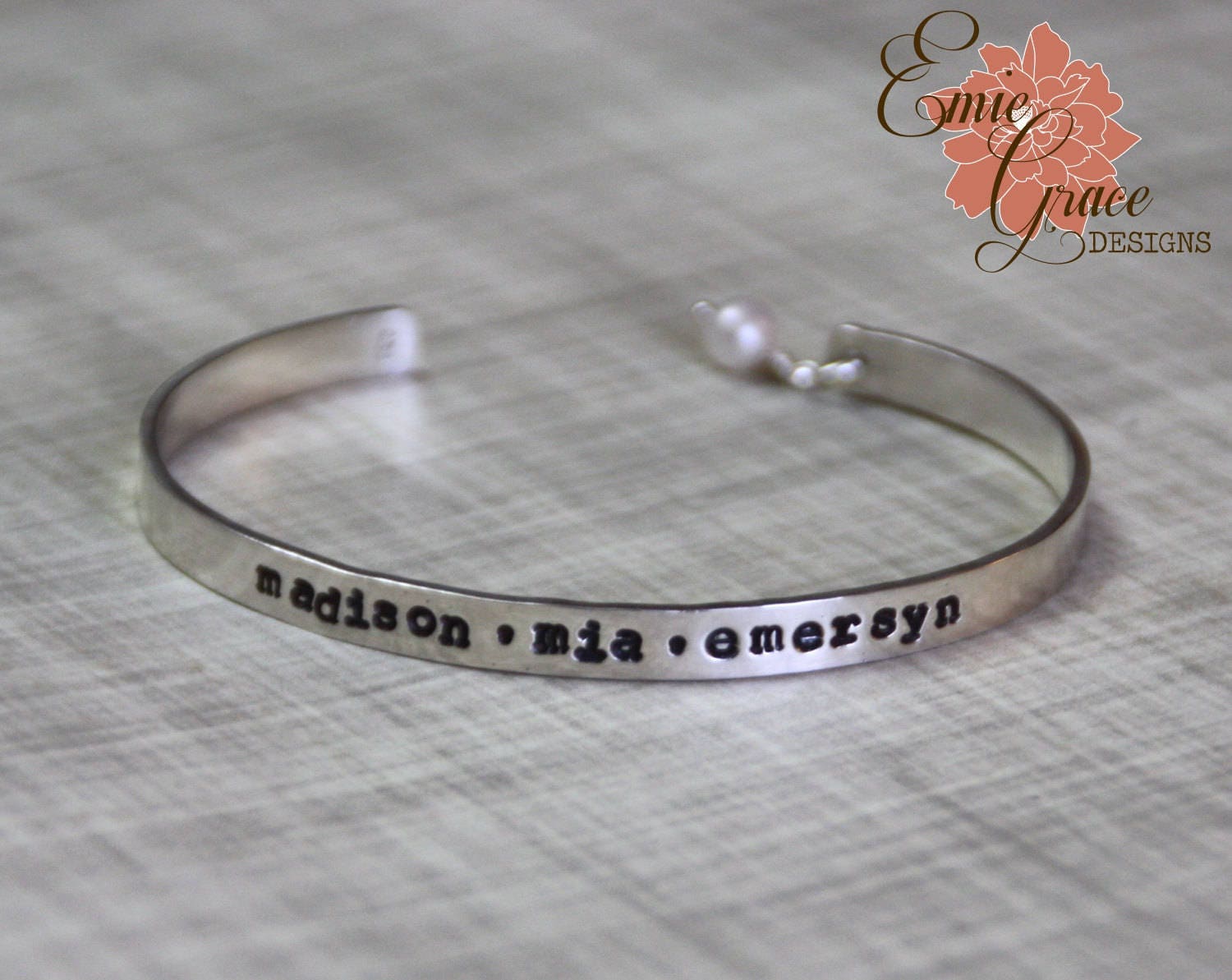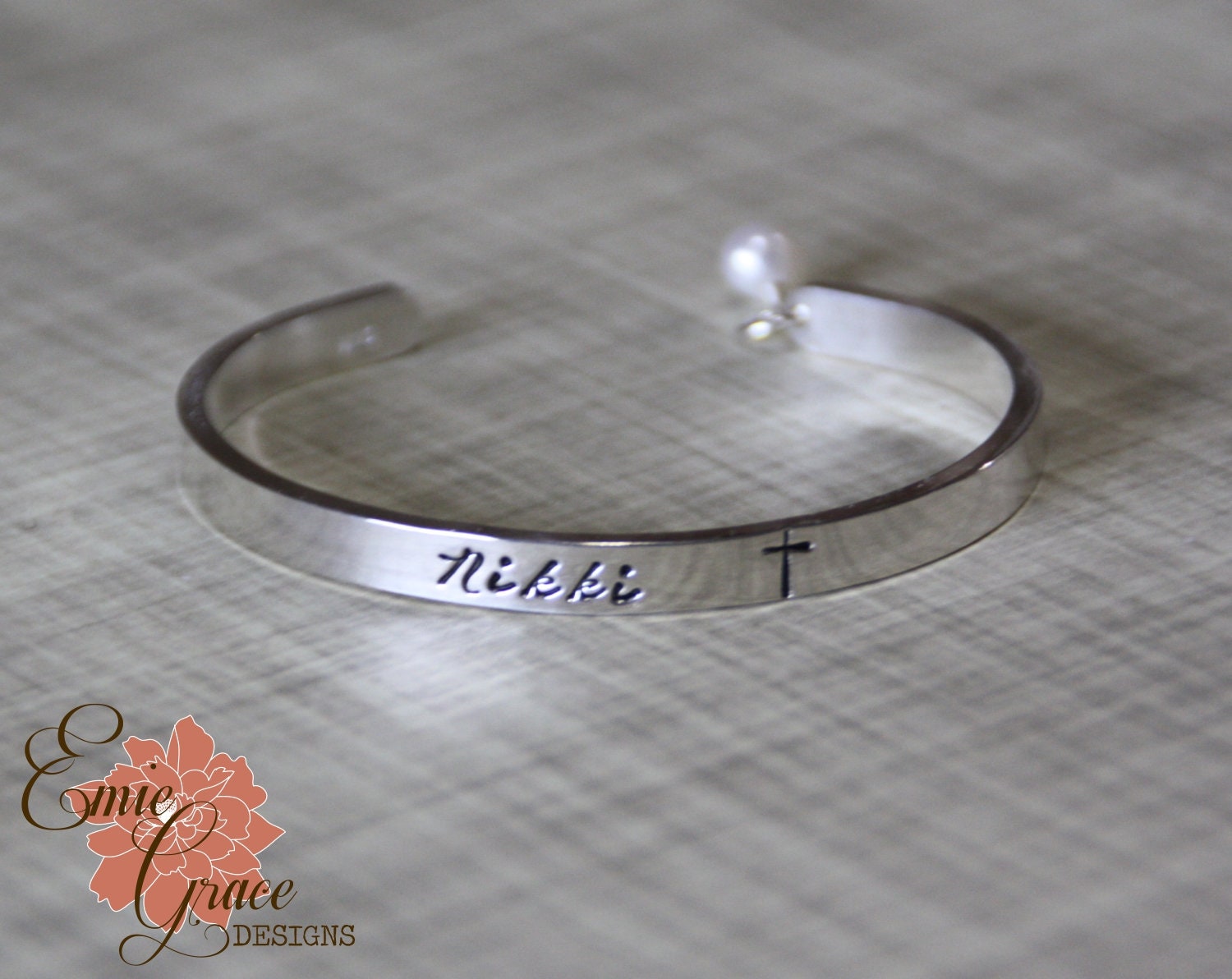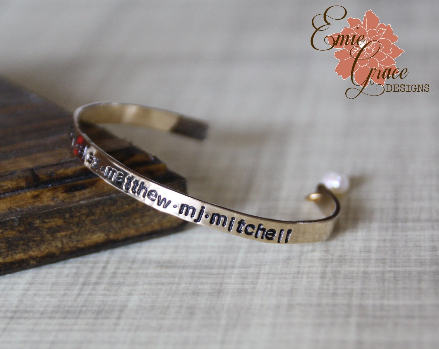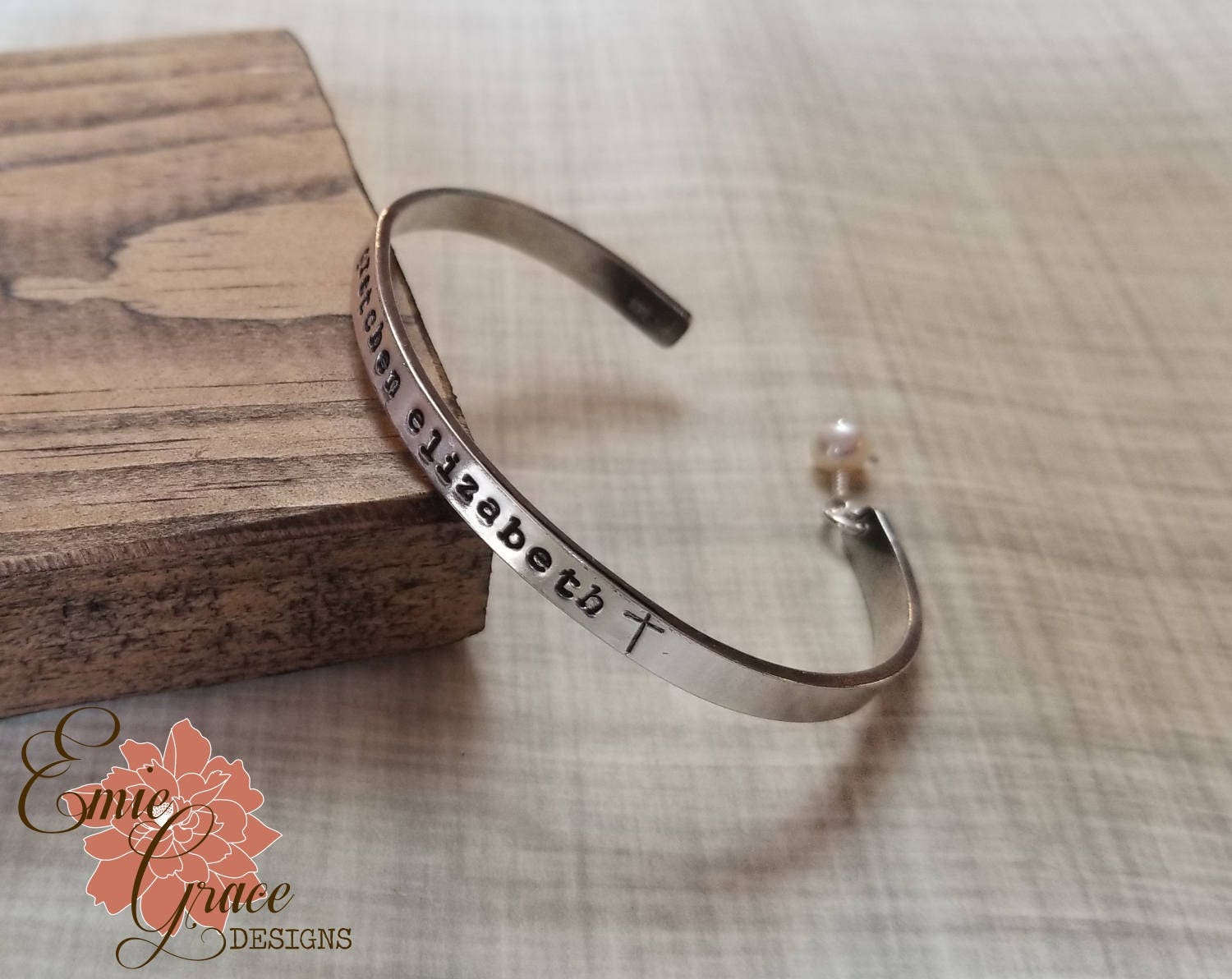 This personalized cuff bracelet is made of sterling silver, gold fill or 14k solid gold and is a staple piece you will wear with everything! Awesome to stack with other bracelets too! This cuff is made by hand, formed, stamped, polished and adorned with a round freshwater pearl. The outside is stamped with the message of your choice or loved ones names. Bracelet will arrive neatly packaged and ready to wear and enjoy, or give as a gift!