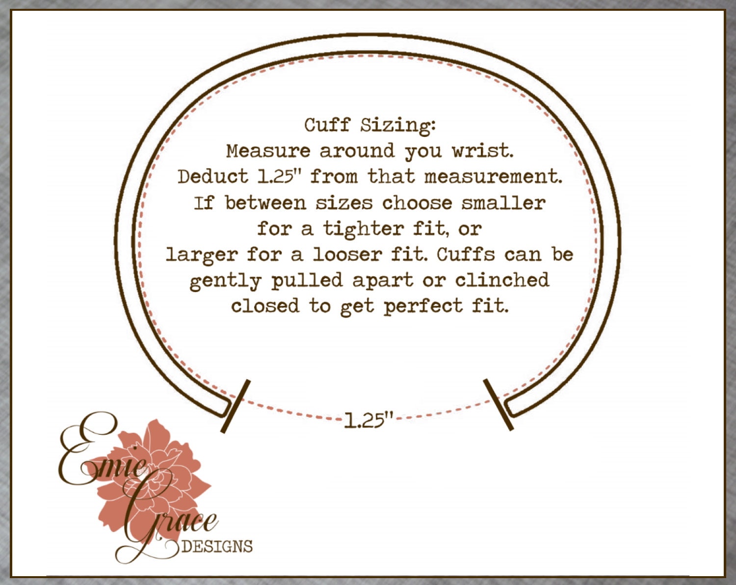 For cuff sizing it is best to measure if you can. To do that you will want to measure around your wrist at the natural location of a cuff bracelet. Now, take that measurement and deduct the 1.25" opening of the cuff. If you're in between sizes you can decide if you want a tighter fit or a looser fit. Keep in mind the cuff will have a little flex to clench it closed a bit more or flex it open a bit more to get the perfect fit. As you wear it it will harden further into that position. So for example; if your wrist measures 6.5", you deduct 1.25" and get 5.25". You can choose 5" for a tighter cuff and flex it open slightly, or choose 5.5" for a looser fit and clench it closed slightly.
