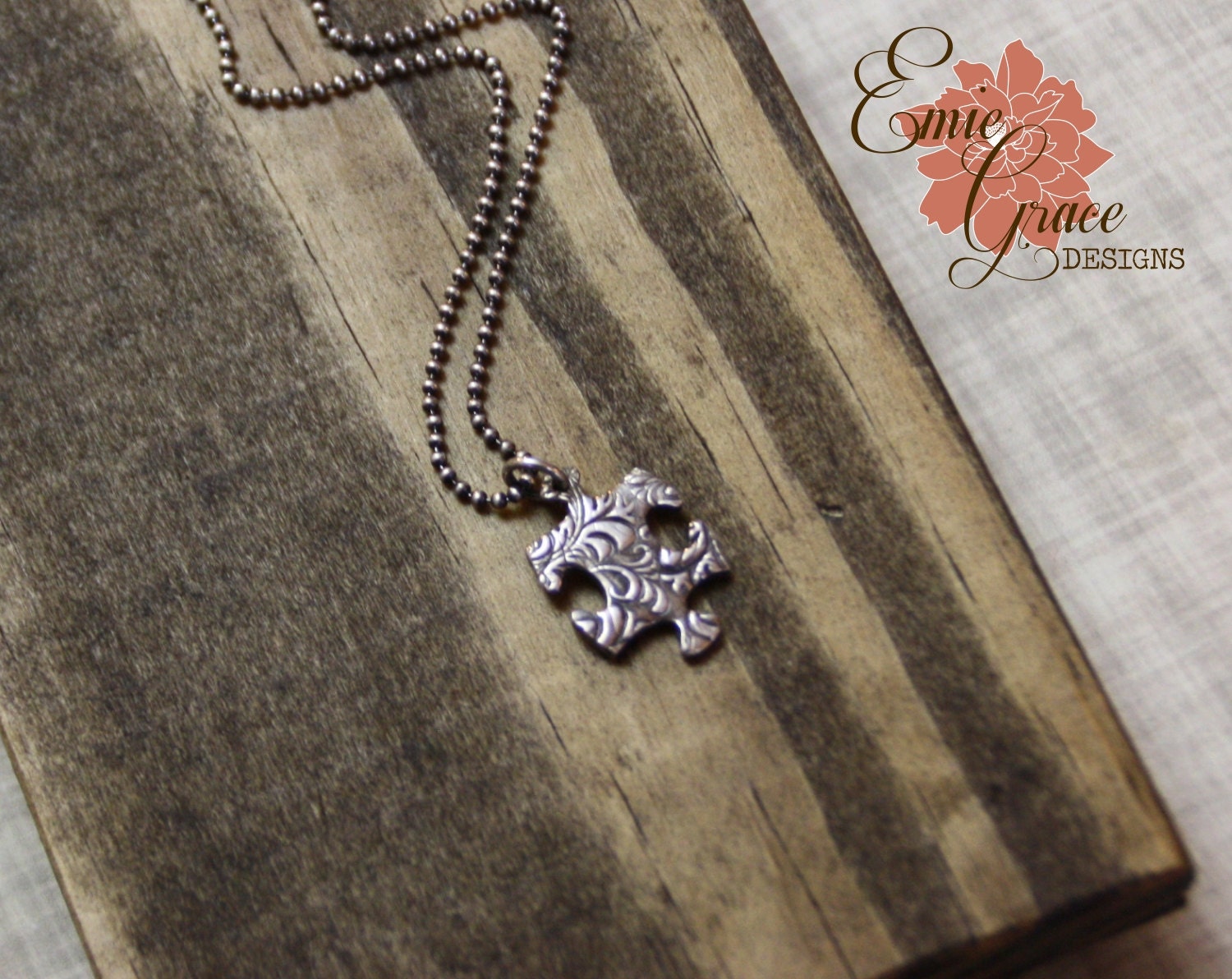 Fine silver puzzle piece necklace with a beautiful floral swirl patterned texture. It is oxidized to bring out the high area of the lovely pattern. The puzzle piece is a symbol for Autism Awareness and would be a very thoughtful gift for someone in your life who has a loved one with Autism. This pendant is handmade using precious metal clay that is fired leaving the end result of only fine silver (.999). All other metal used in this necklace is sterling silver (.925). Necklace arrives neatly packaged and ready to wear and enjoy, or give as a gift!
