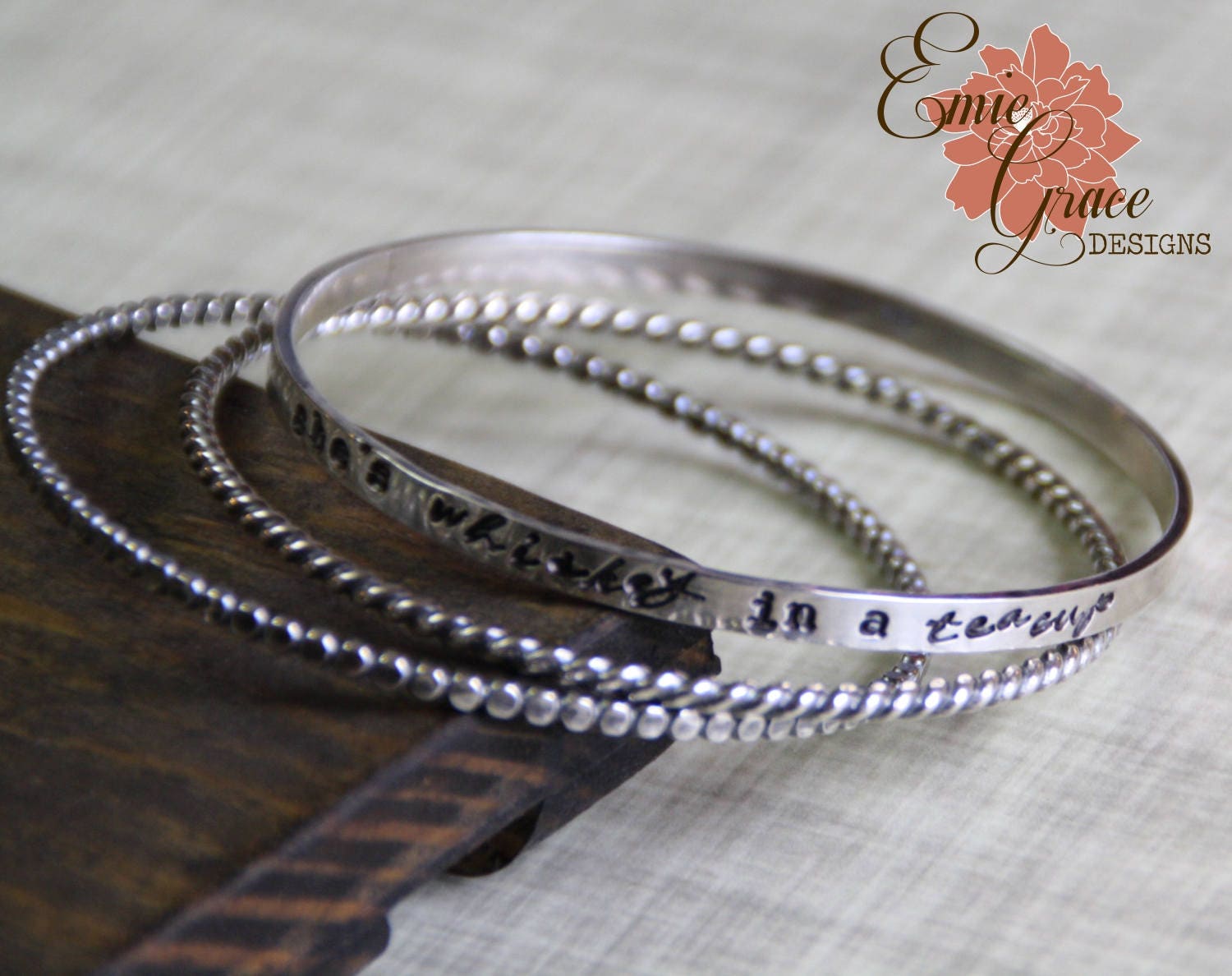 This trio of bangle bracelets is made of sterling silver. Each bracelet in made by hand, formed, oxidized and polished. One is a flat smooth bangle hand stamped with "She's Whiskey in a Teacup." The other two bangles are a hammered dot bangle and a twisted bangle. The trio of bangles has been oxidized for a lovely rustic patina. Bracelets will arrive neatly packaged and ready to wear and enjoy, or give as a gift!